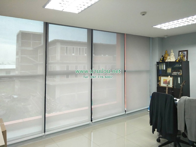 ผลงานจากทางร้าน ติดตั้งม่านม้วน ประเภท Sunscreen สีเทา ระบบดึงโซ่ไข่ปลา สีขาว ตกแต่งบริเวณกระจก ภายในห้องทำงาน เพื่อช่วยกรองแสง เพิ่มความเป็นส่วนตัว ทำให้สามารถใช้เวลาพักผ่อนภายในห้องทำงานได้เป็นเวลานานๆ โดยที่ไม่รู้สึกอึดอัด และร้อนอบอ้าวจากแสงแดดจากด้านนอกอีกด้วย